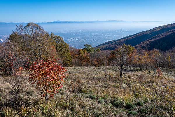 Тръгнах обратно към колчето, което подминах по-рано. Този път завих в указаната посока, а половин час по-късно се озовах на живописно място подходящо за фото почивка. От скала, която няма как да пропуснеш се разкрива панорамна гледка към полите на Витоша с телевизионната кула над тях и София в краката ѝ.