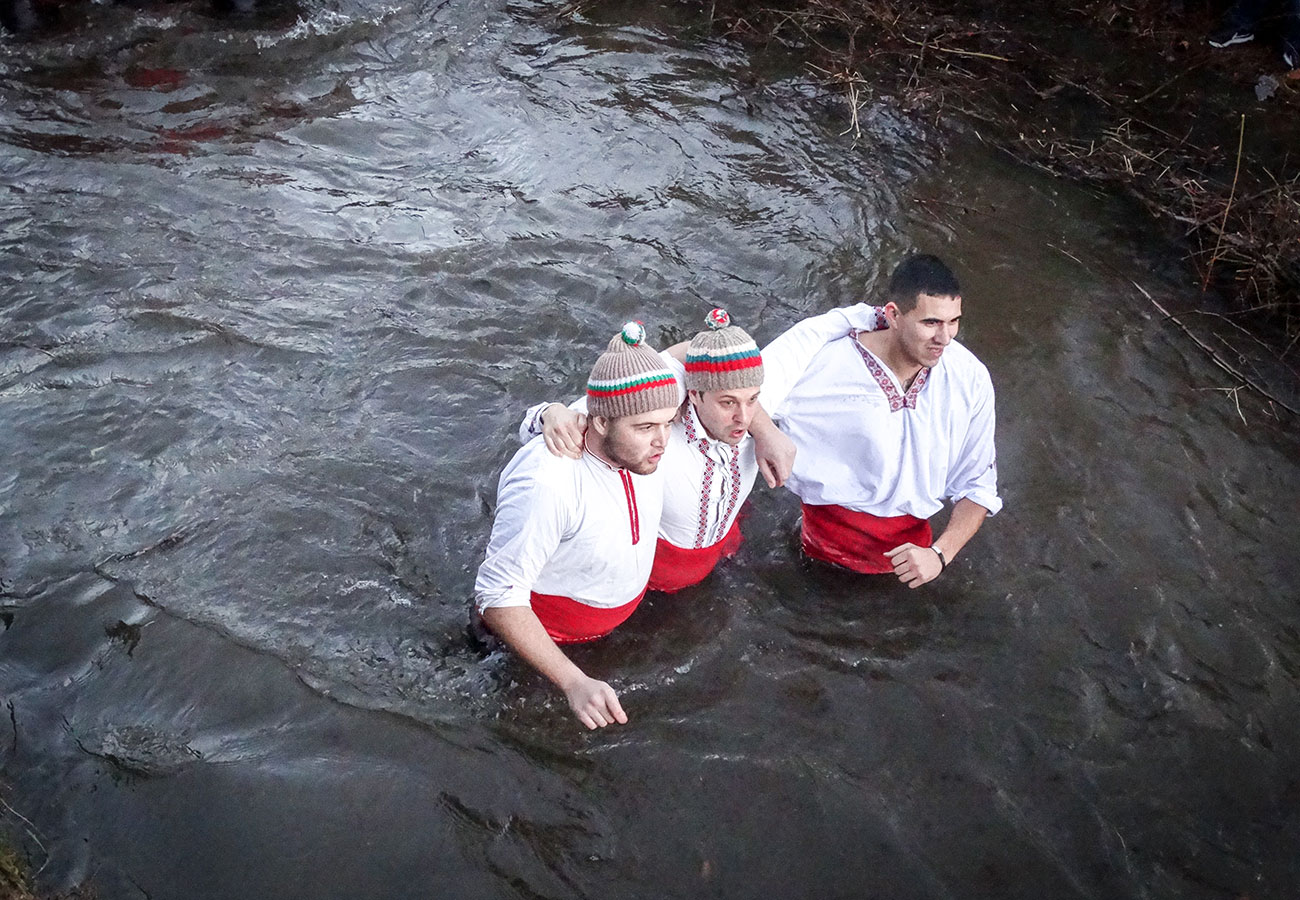 Следва така чаканото мъжко хоро в по-широката част на реката до моста. Български знамена се веят в студените води, калоферчани пеят и танцуват. Възторжени викове ехтят.