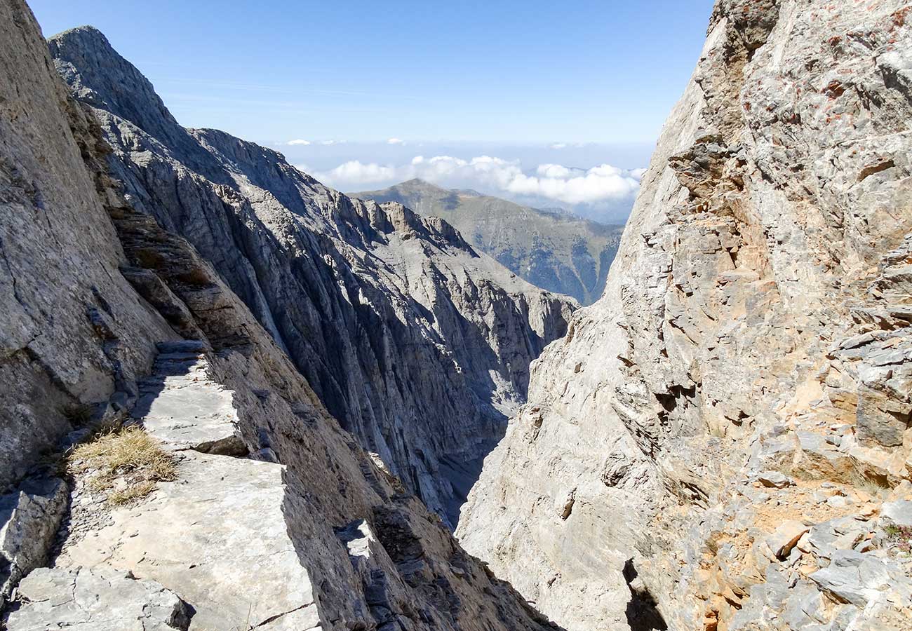 След кратка почивка и хидратация поехме към Митикас. Пътеката започва от един улей в непосредствена близост до първия покорен връх. Ще се повторя - от този етап до финала с каска! И стриктно следвай червените маркери разположени почти на всеки метър - няма място за своеволия и "велики" изпълнения. Един съвет, който попих от нашия водач - пробвай да вървиш изправен където позволява терена за по лесна адаптация. Не е толкова страшно, колкото изглежда на пръв поглед - просто на мозъка му трябва малко време да възприеме необичайните условия по които трябва да те накара да преминеш. (: